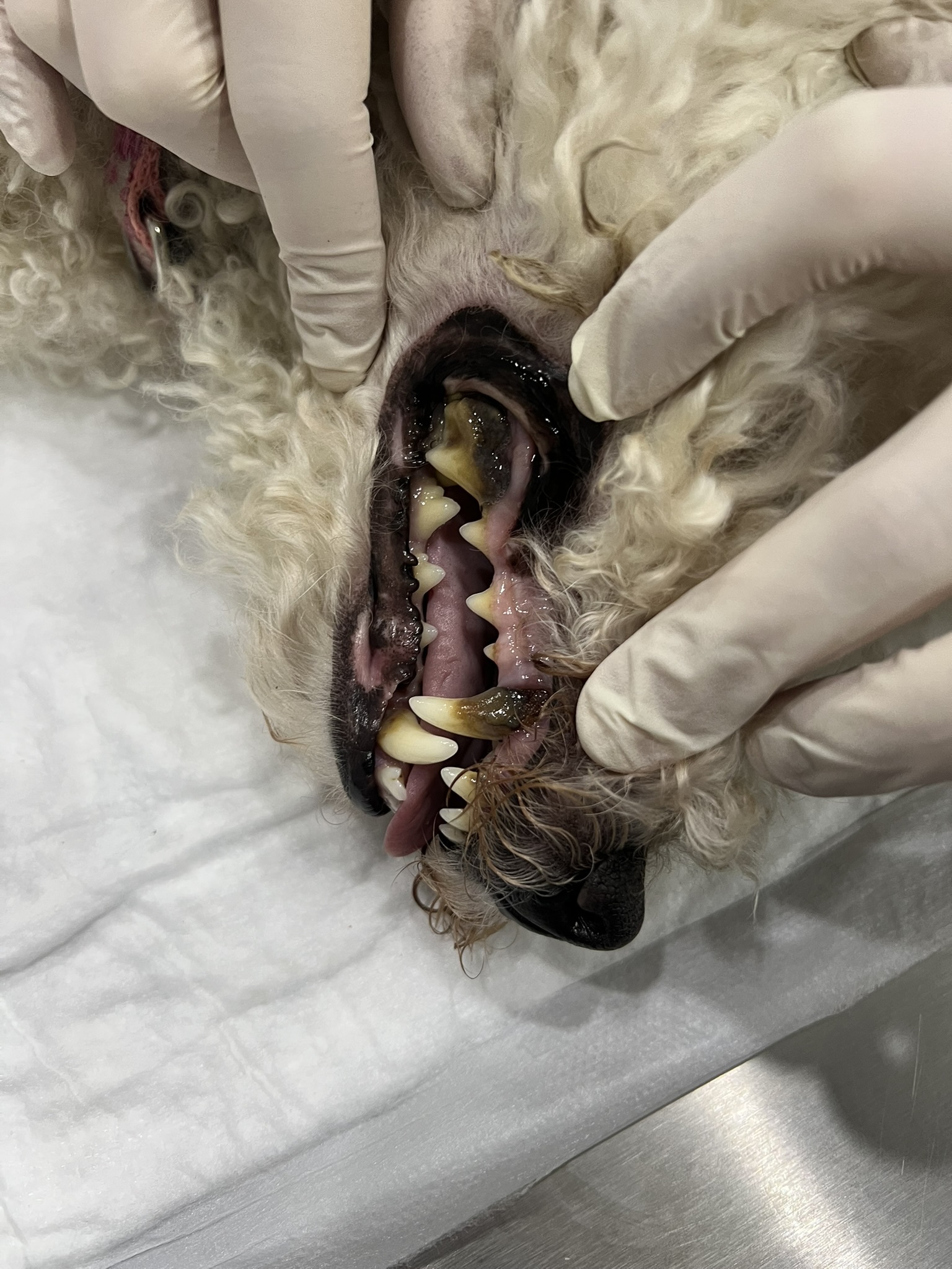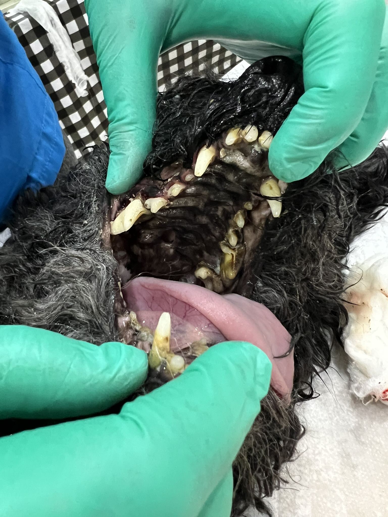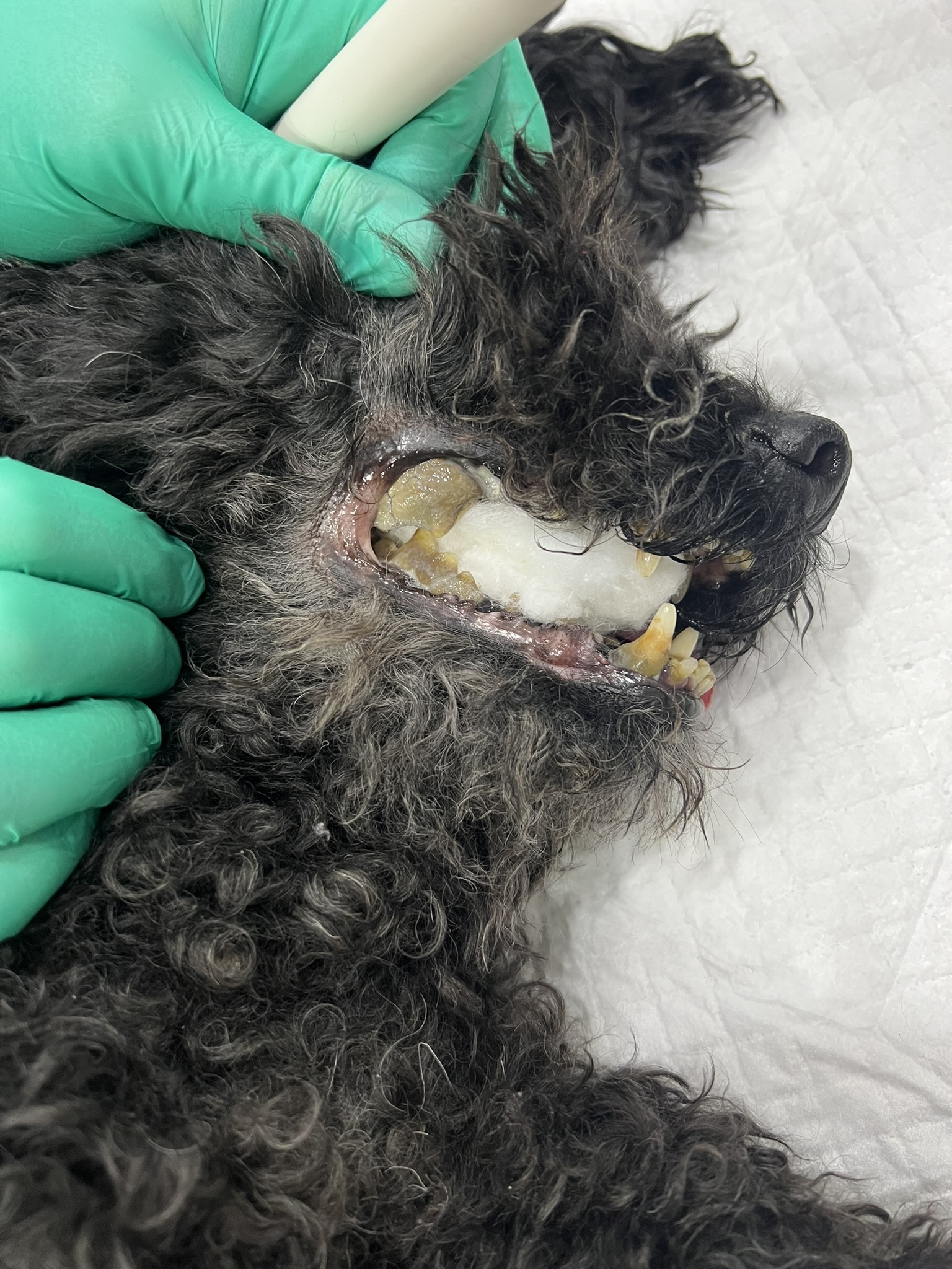 We admitted Richie for ultrasonic dental cleaning. During the procedure, it became clear that the issue was not limited to tartar alone. We identified consequences that could have been prevented with earlier care: an oronasal fistula, a pathological connection between the oral cavity and the nasal passages. In addition, several teeth were so severely destroyed that they could not be preserved, and eight teeth had to be extracted.